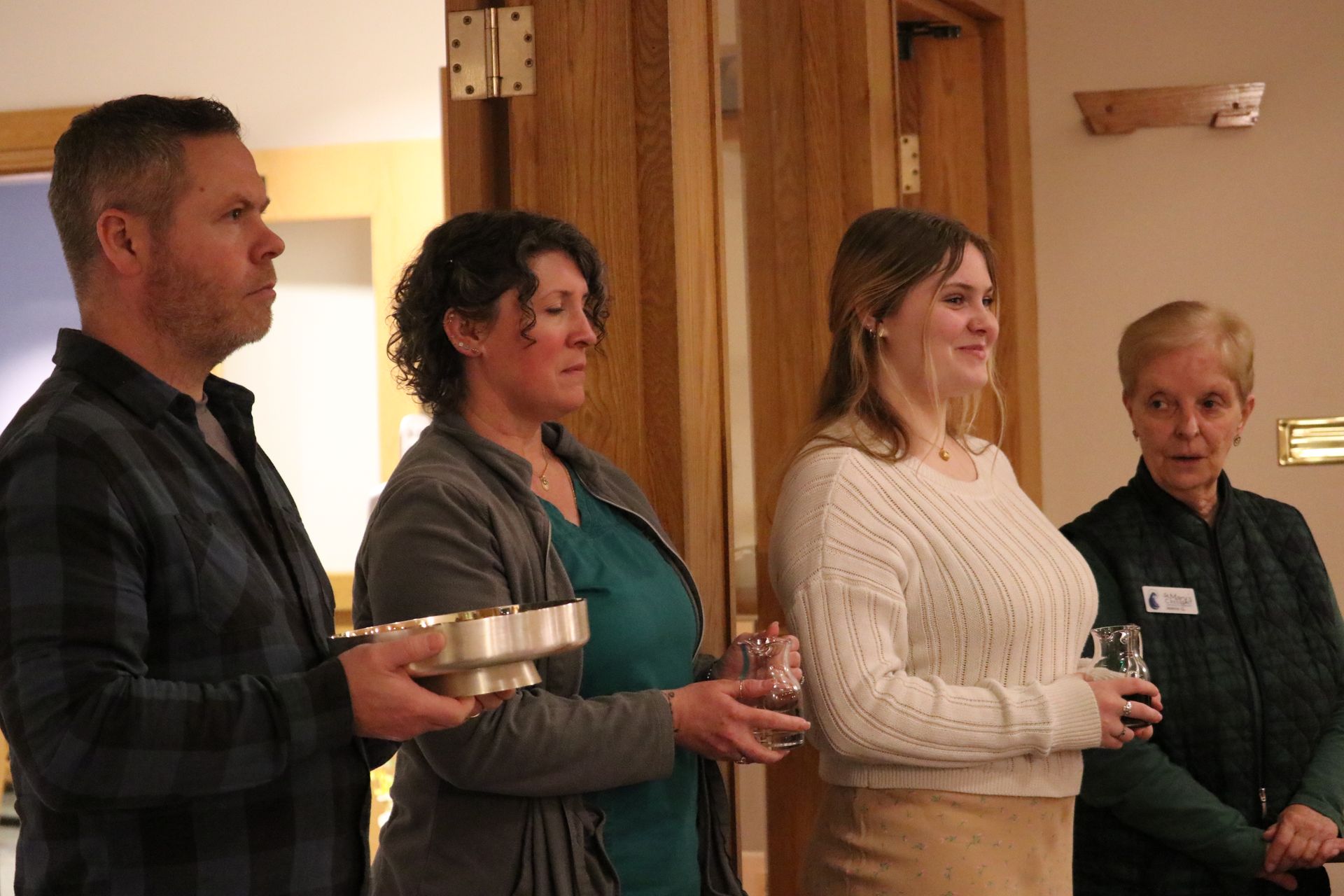 Hospitality team members greet the people before Mass, take up the collection, and distribute church bulletins at the end of the liturgy.